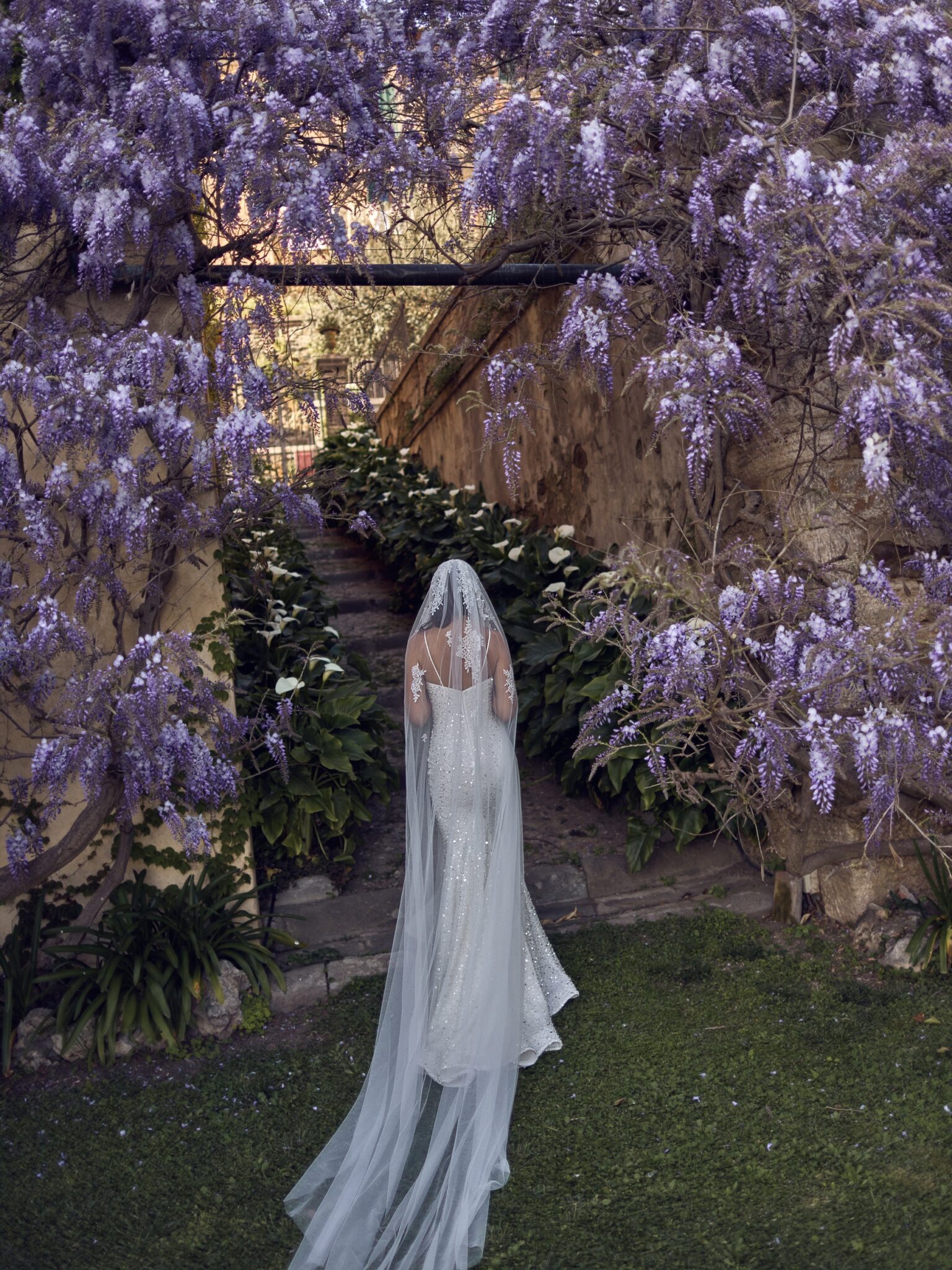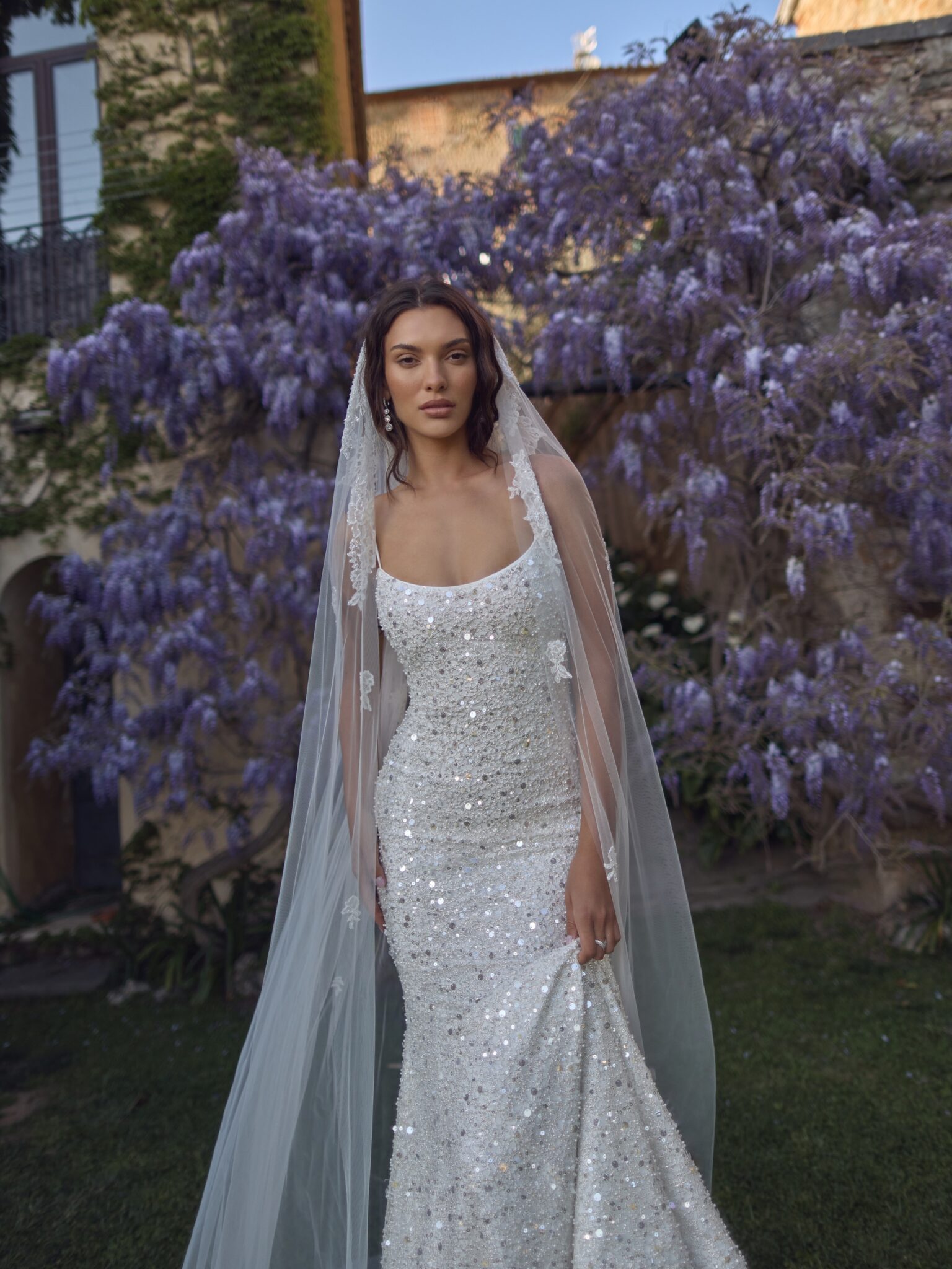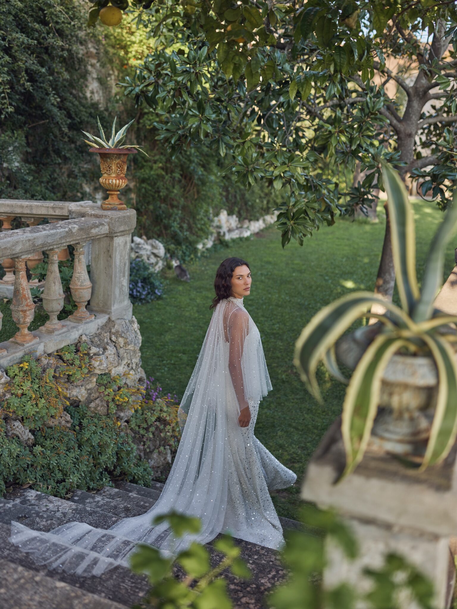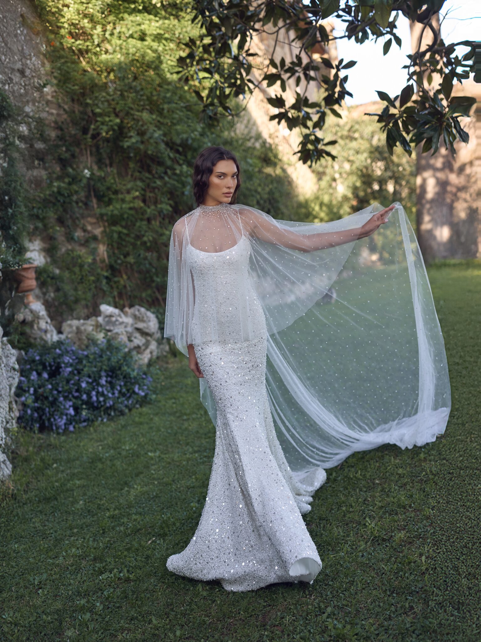 Amore in FioreTirade gown is a refined mermaid silhouette paired with a shimmering cape. The dress is crafted from glittering lace that catches the light with every movement, offering a subtle yet enchanting glow.