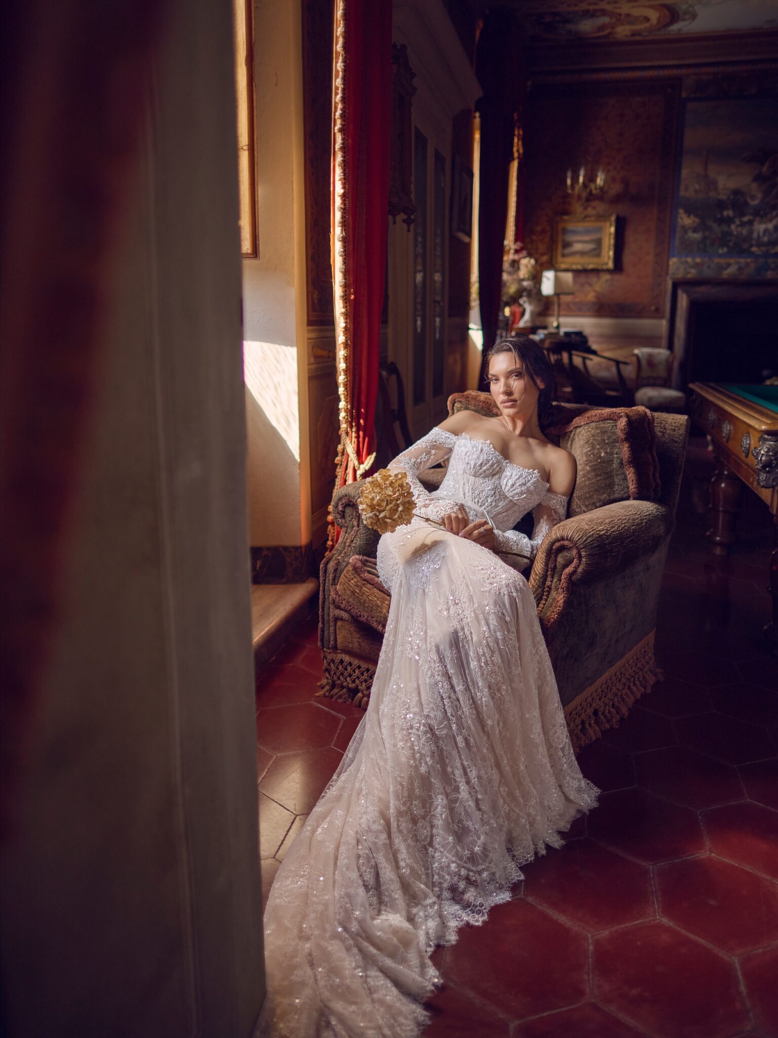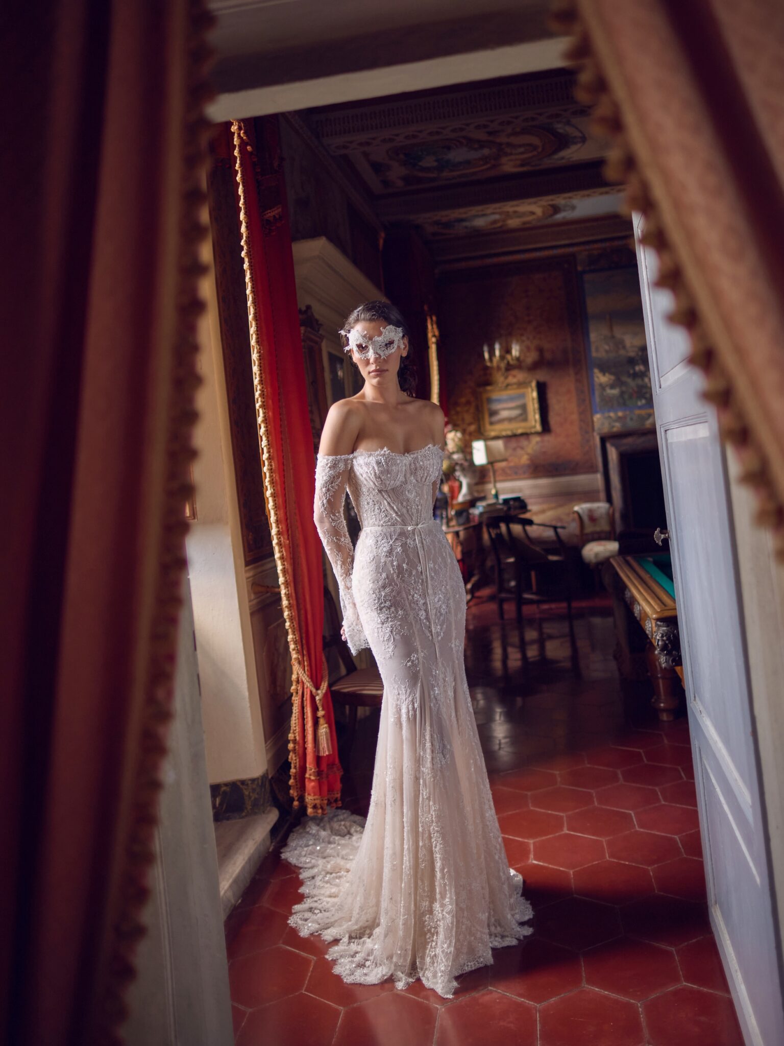 Amore in FioreAn elegant mermaid silhouette gown crafted from luxurious lace. The sheer corset is adorned with intricate lace detailing and comes without built-in cups, offering a modern and daring look. The long sleeves gracefully flare out toward the wrists, adding a refined touch of drama. The gown features layered linings in cappuccino and ivory tones, creating a soft contrast beneath the lace. With an open back and a sharply shaped train, the Triumph dress makes a bold, unforgettable bridal statement — perfect for brides who want elegance with an edge.