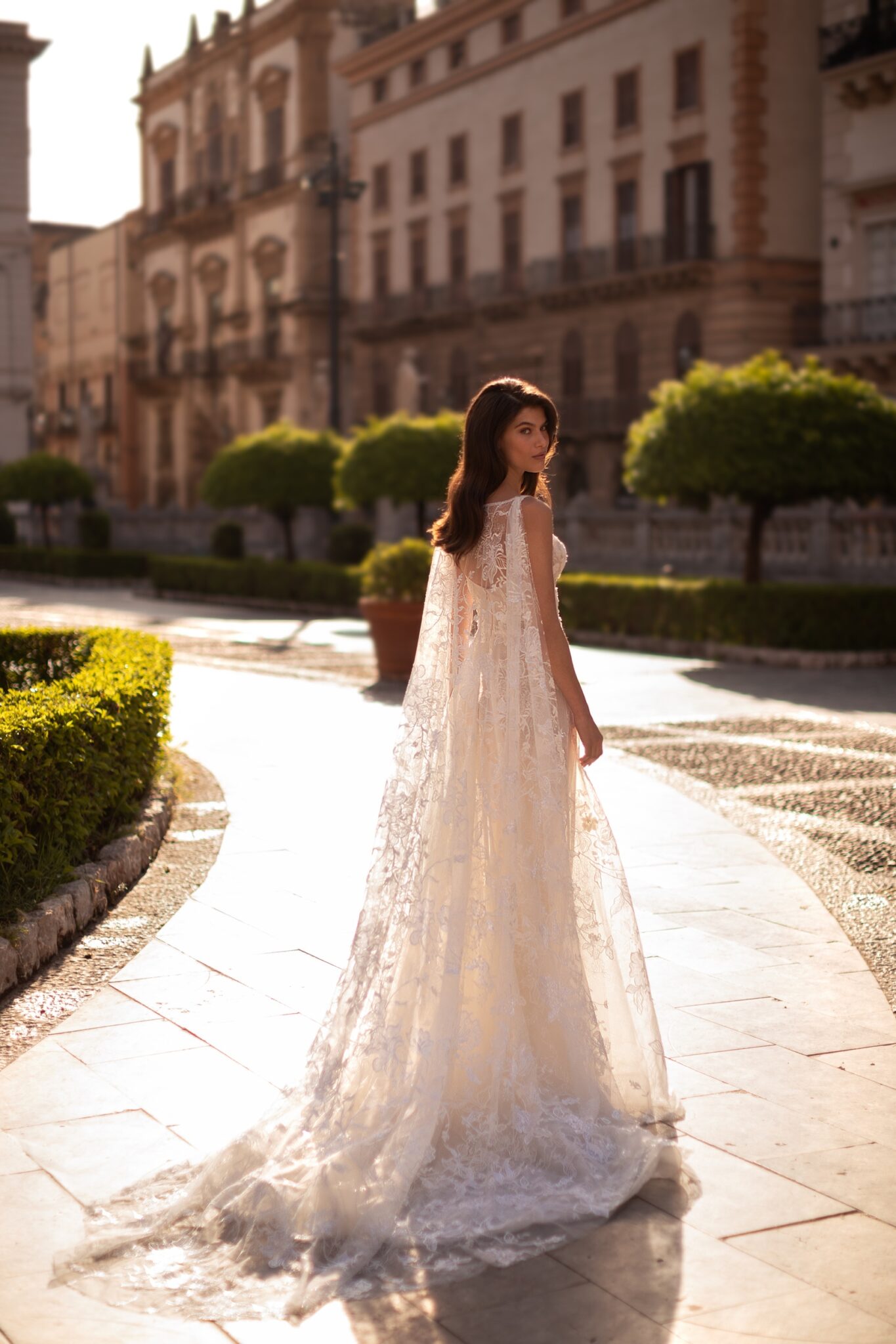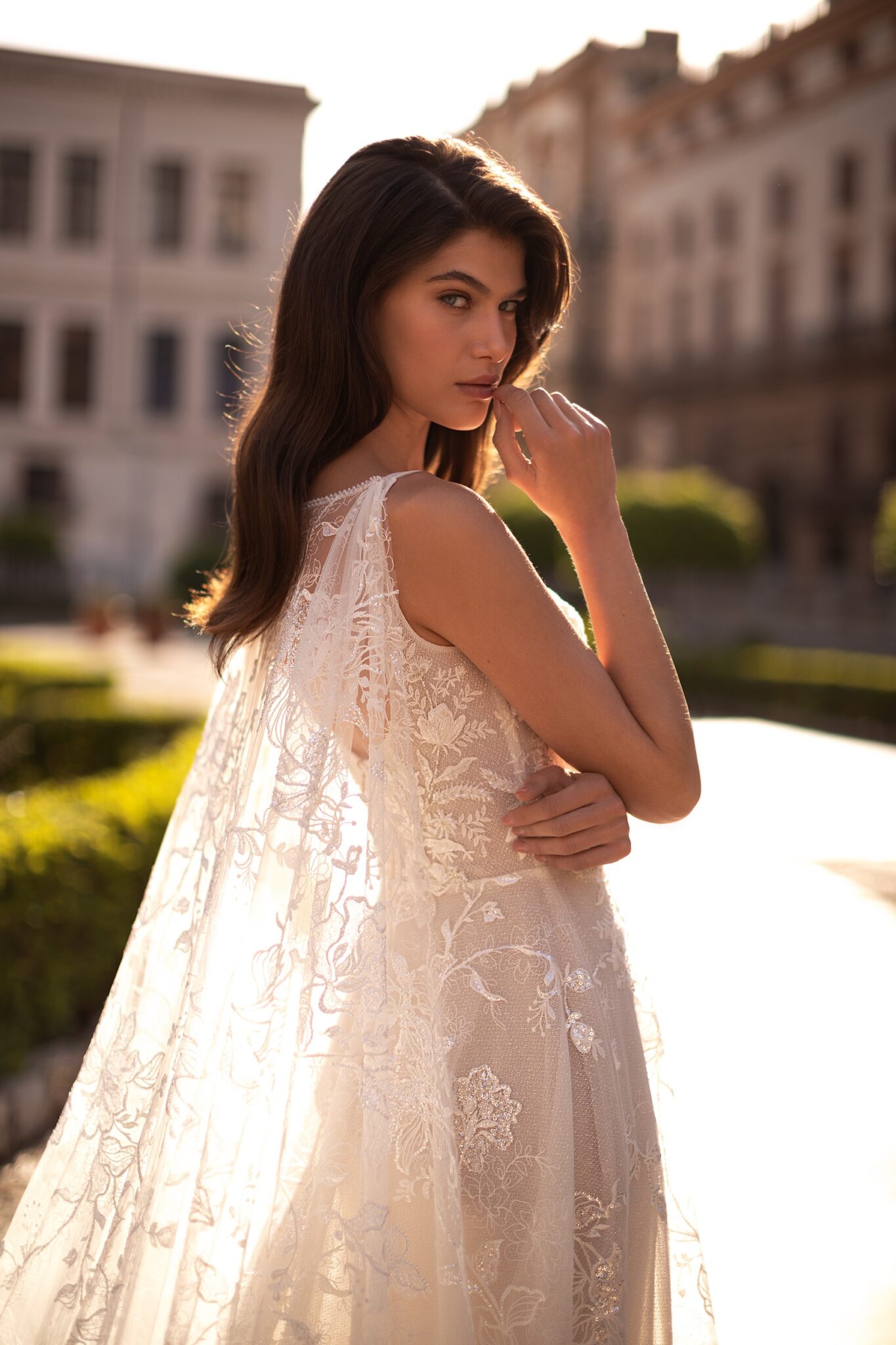 Made 4 LoveEnchanting, stately, and sexy, this soft A-line corset dress is adorned in embroidery and sparkly silver sequins. A corset features a delicate sweetheart neckline with straps and a voluminous translucent A-line skirt with flower appliques embellished in delicate all-over silver beading. A special sophisticated twist hides in a magnificent semi-ilusion cape attached on the shoulders creating a fantastic long train.