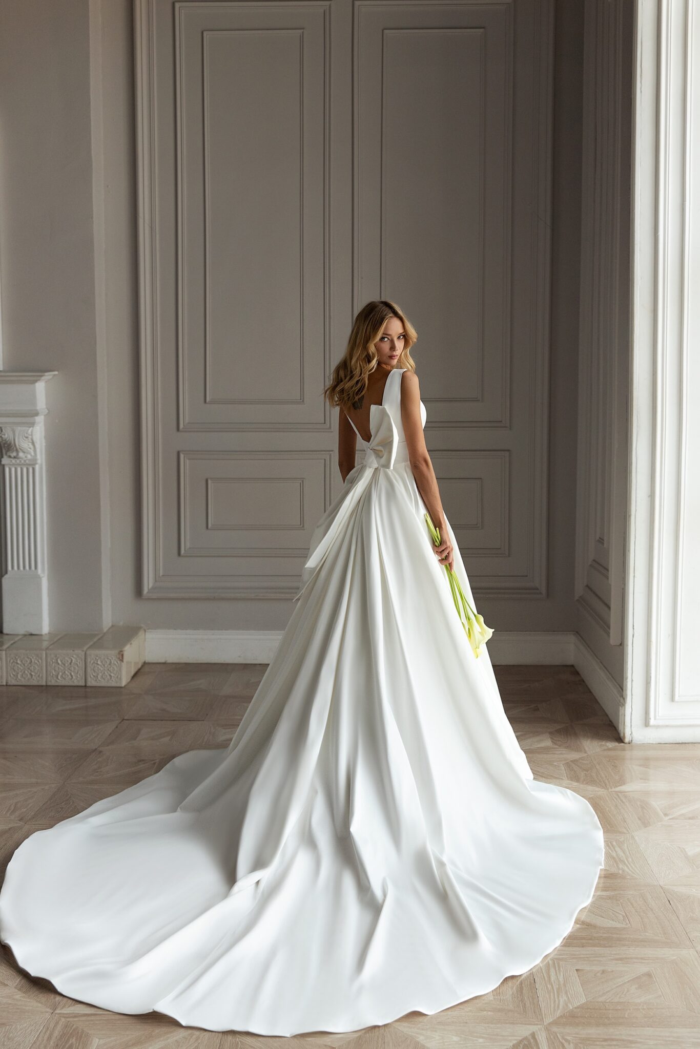 Less is more 2021Valery is an incredible A-line wedding dress with a long fabulous train. The gown is made of fantastic glossy fabric. It is decorated with a low neck and a deep neckline at the back of the dress. An enormous bow highlights a waistline and draws attention.