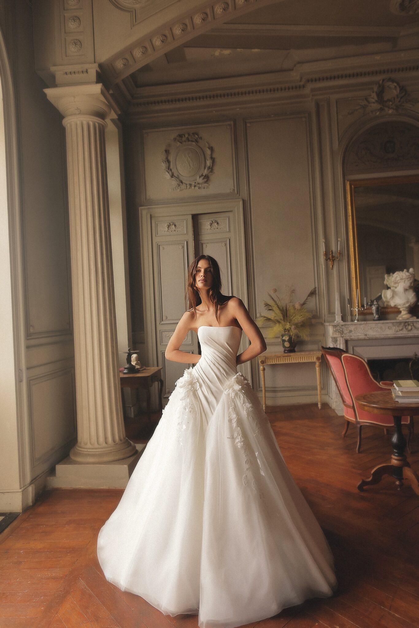 Atelier La Femme EditionVeneto gown is a magnificent off-shoulder princess ball gown designed to create a truly fairytale bridal look. The corset is crafted from structured suiting fabric with elegant draping and fastens with a zipper at the back, beautifully shaping and defining the waistline. The voluminous skirt is made of soft layers of tulle with multiple linings for fullness and movement. The waist is adorned with handcrafted 3D flowers and appliqués that cascade gracefully from the waist down the skirt, creating a breathtaking decorative flow. A long, sweeping train completes the look with regal drama and timeless romance.