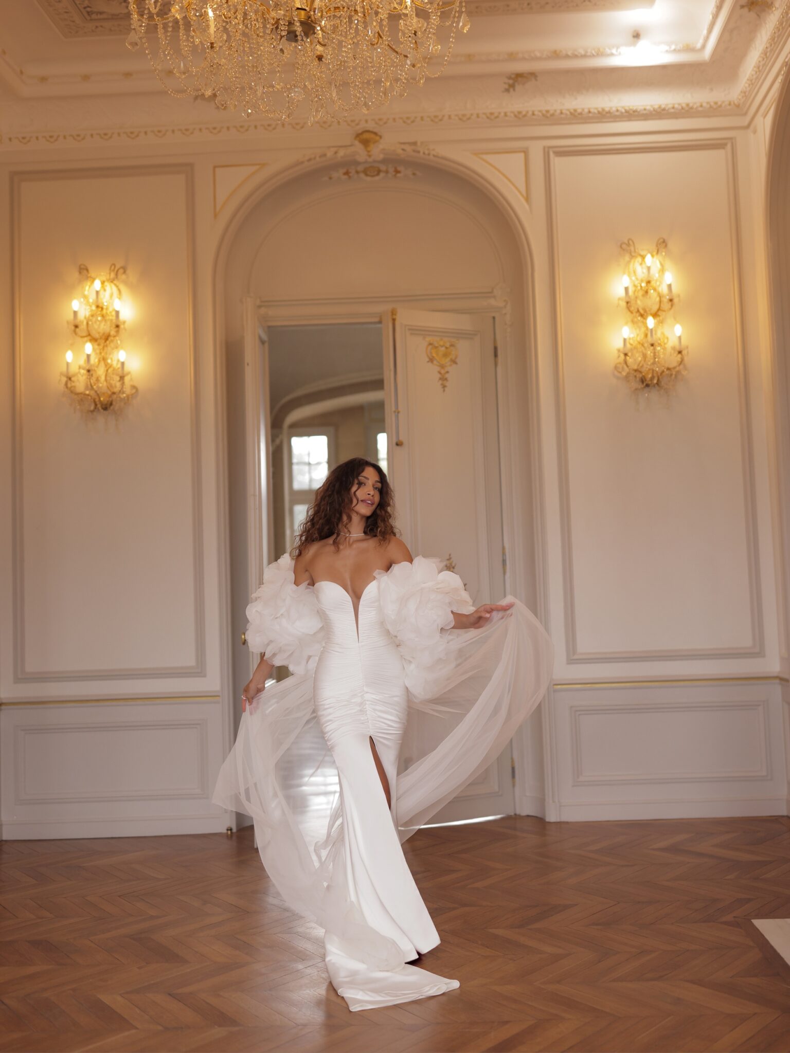 White SwanClassic trumpet dress with a deep plunging neckline and draped details. The skirt features a central slit while the voluminous ruched bolero and sheer veil complement the outfit.