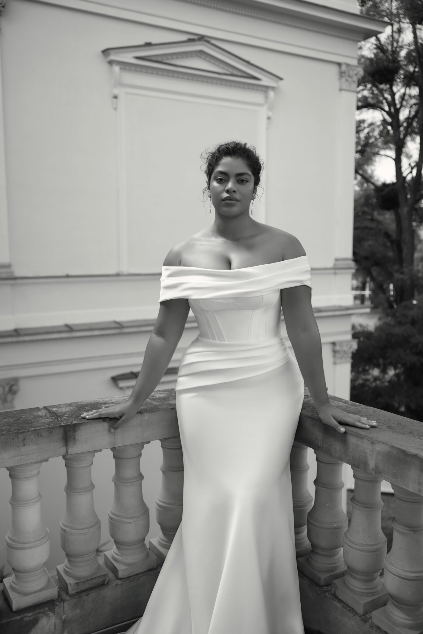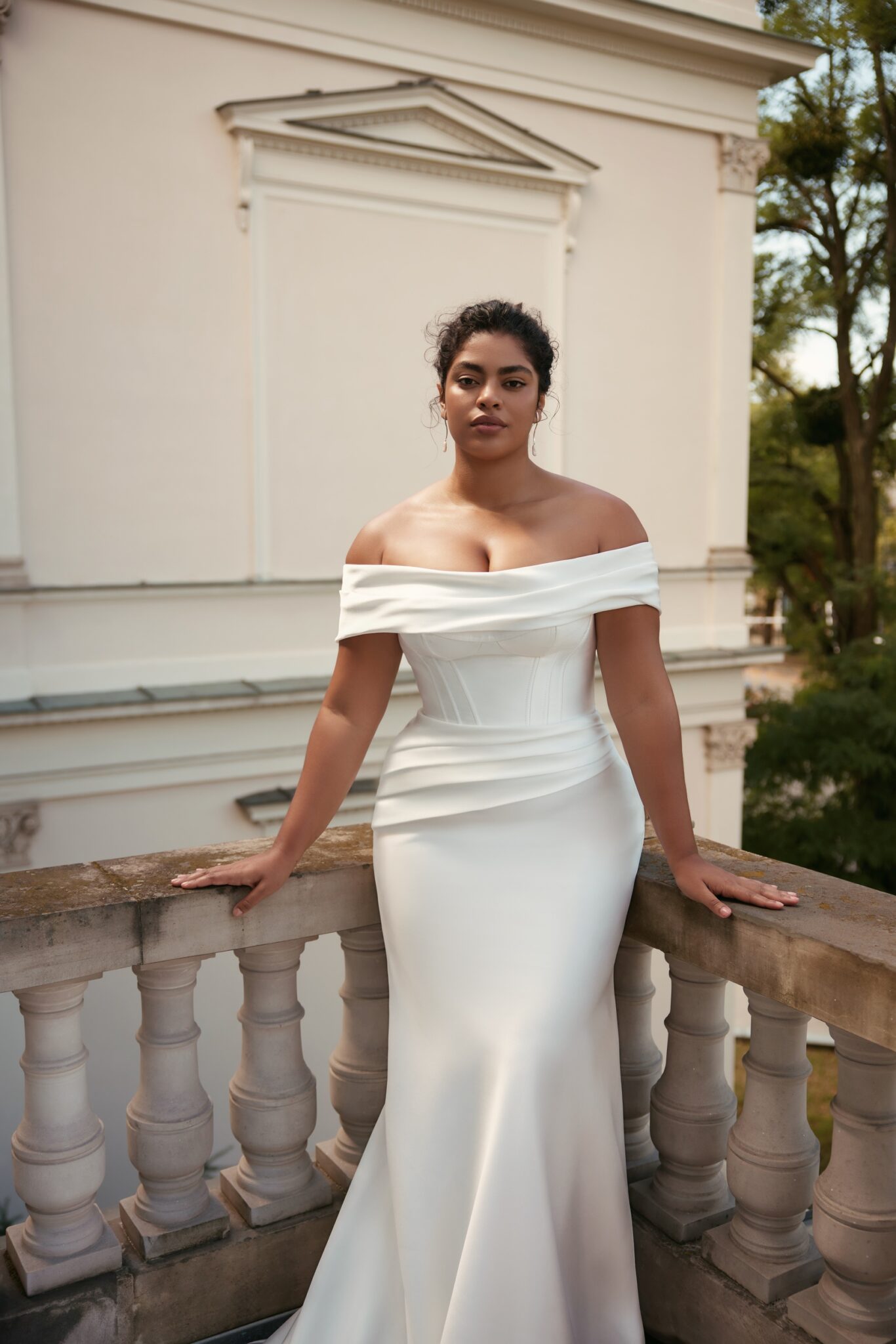 GeminiVerona – cold-shoulder straight neckline corset base dress with draped details on the upper part of the skirt. Complemented with a veil.