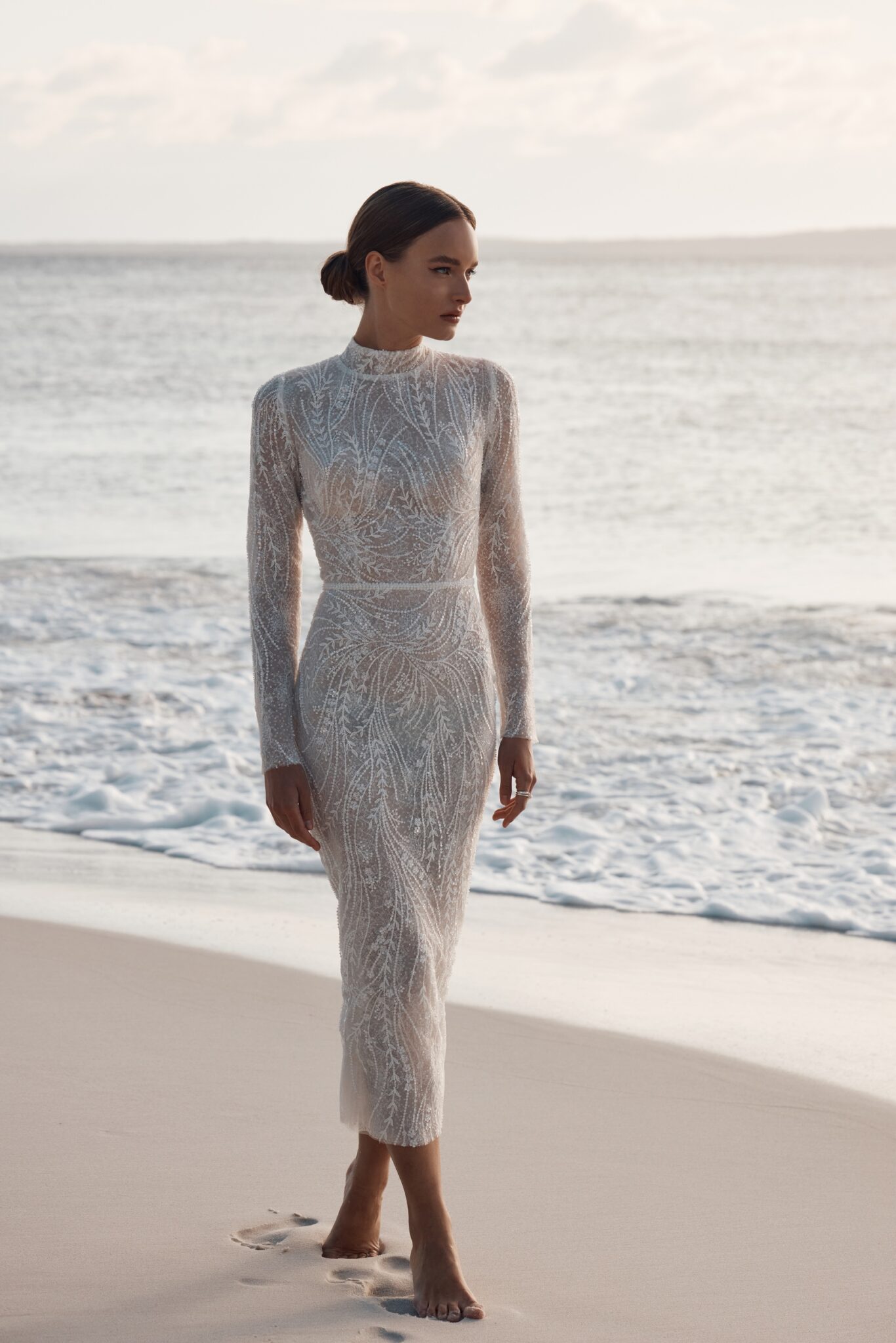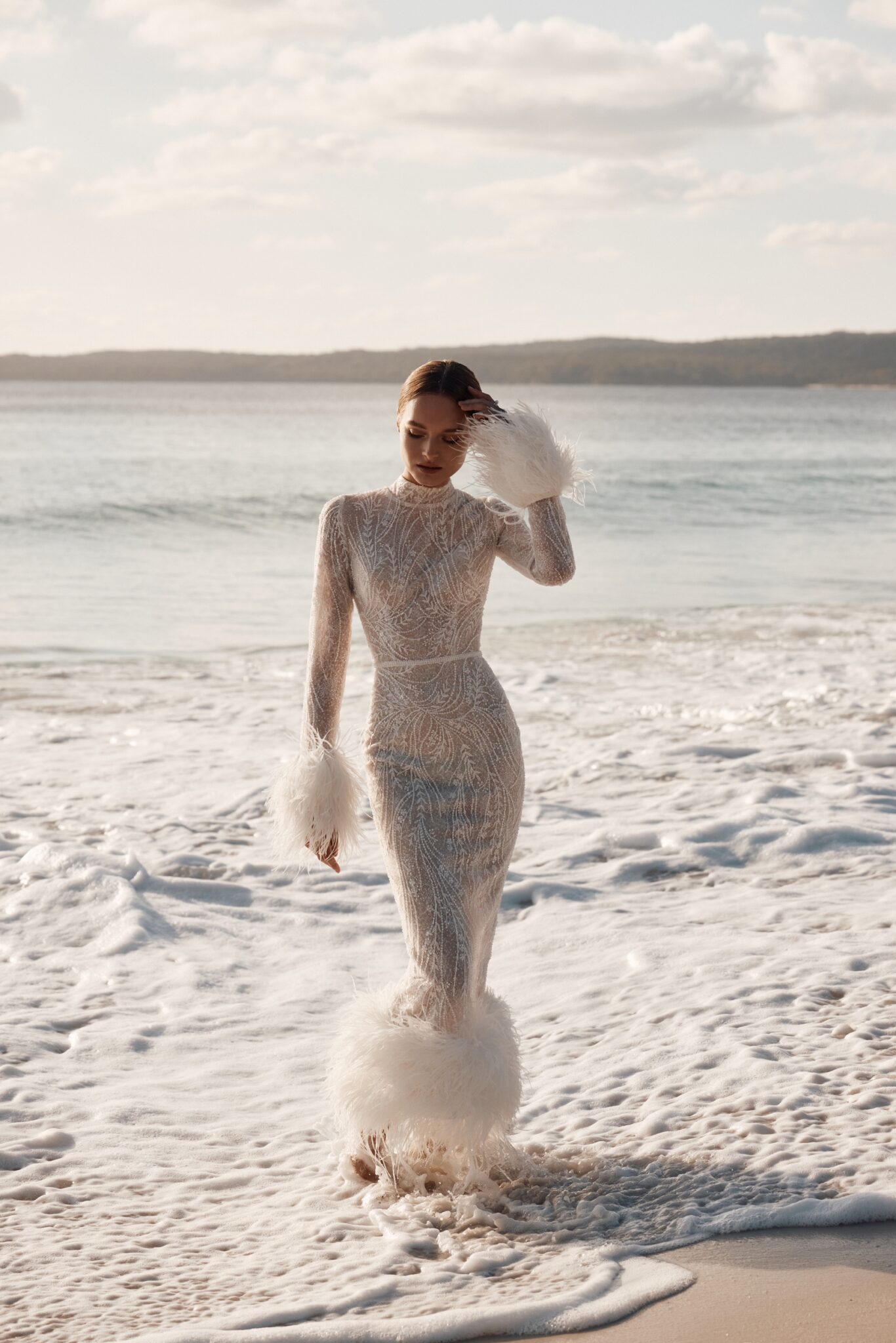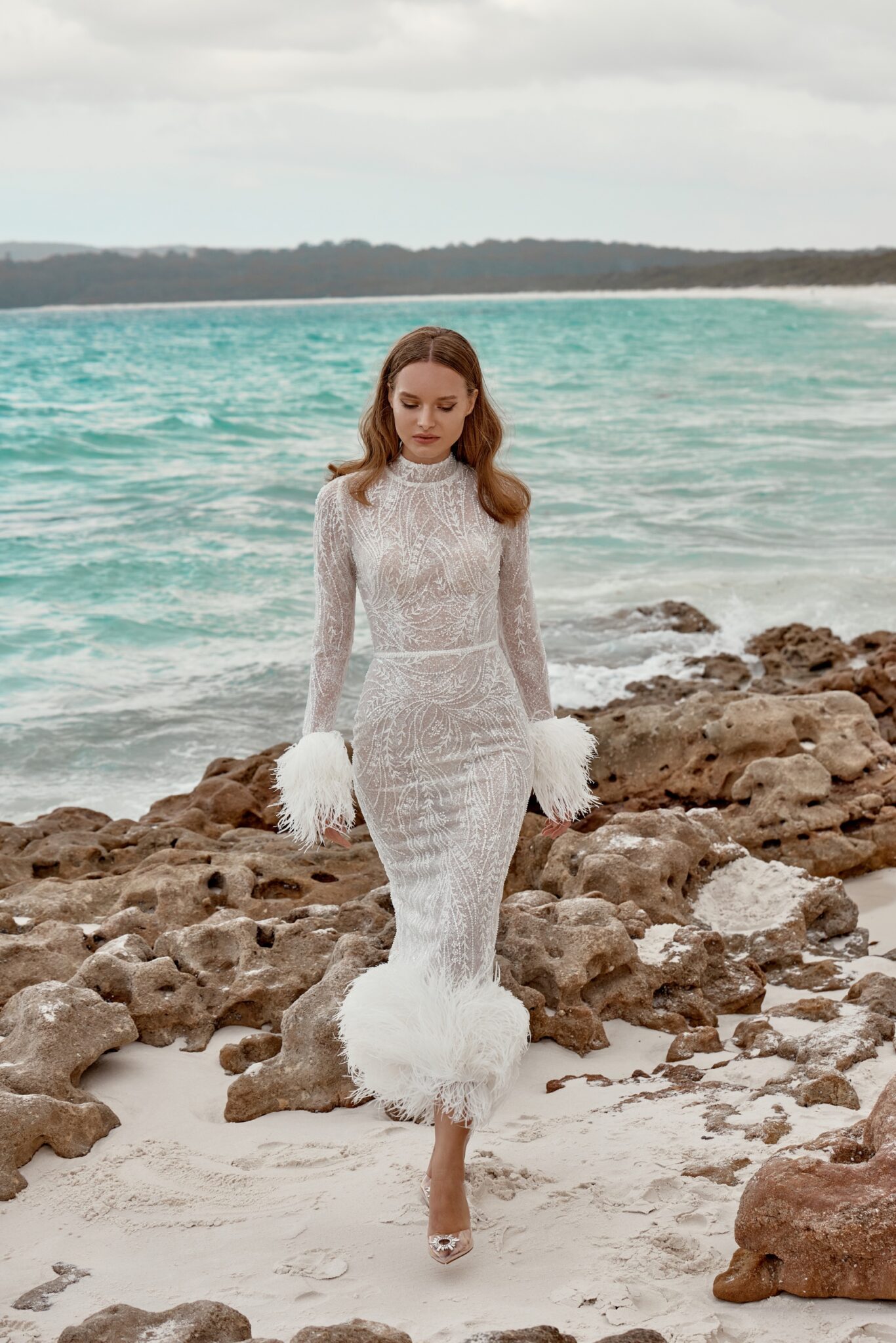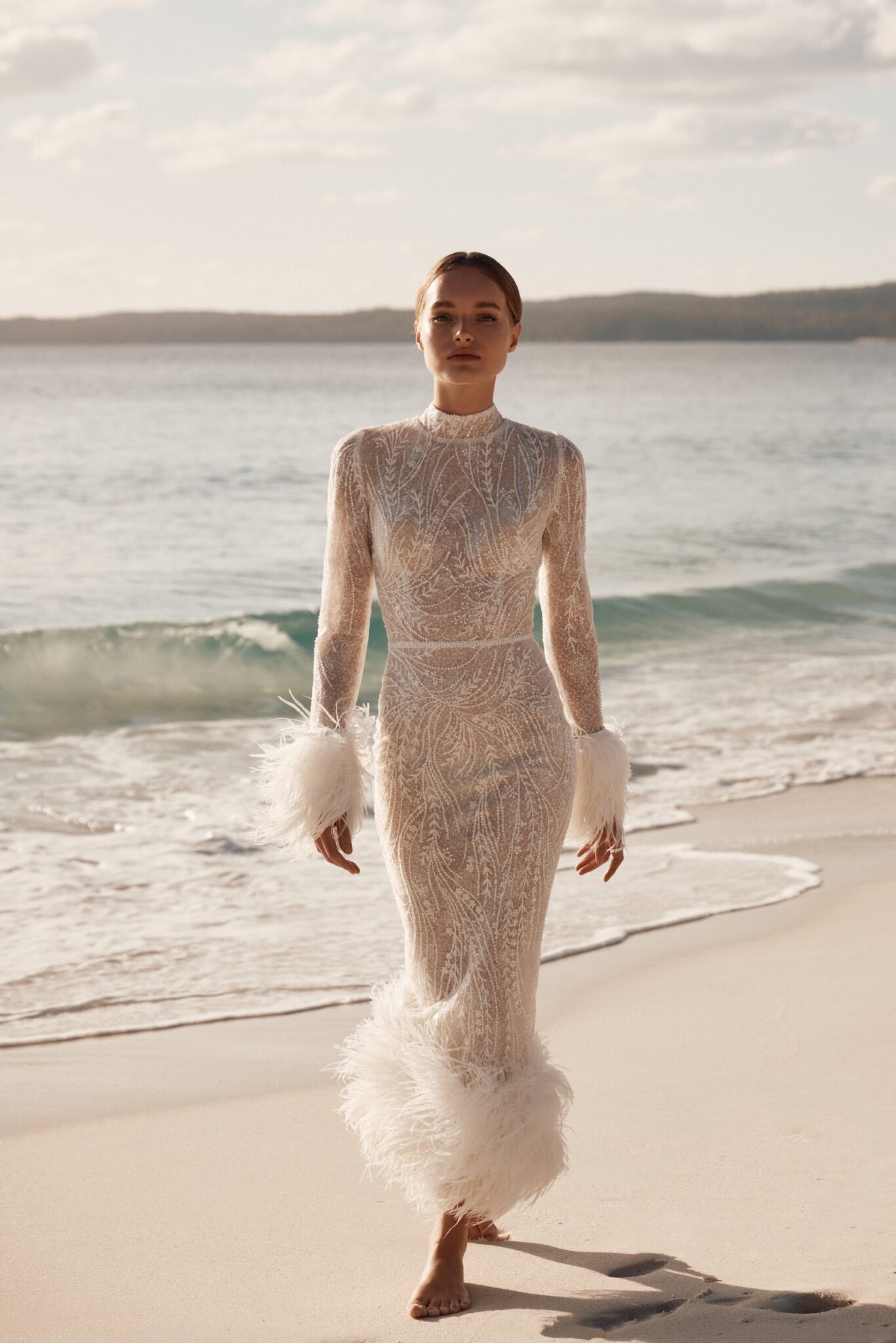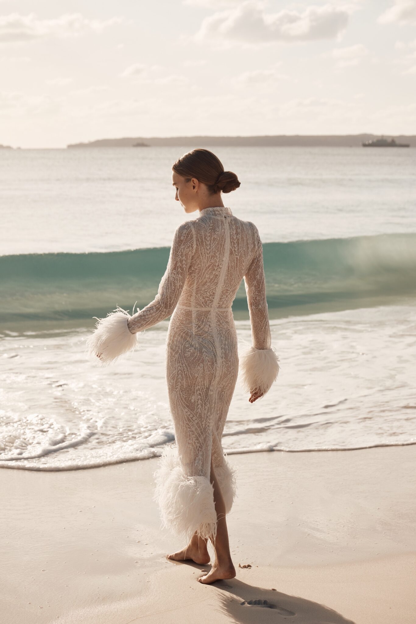 Atelier signature editionThis fitted midi wedding dress oozes vintage charm, a masterpiece of beaded lace. The detachable feather trim along the sleeves and the dress’s bottom adds a whimsical touch, reminiscent of a bygone era. It’s the perfect choice for a bride who wants to capture the timeless romance of a vintage wedding while adding a touch of modern versatility.