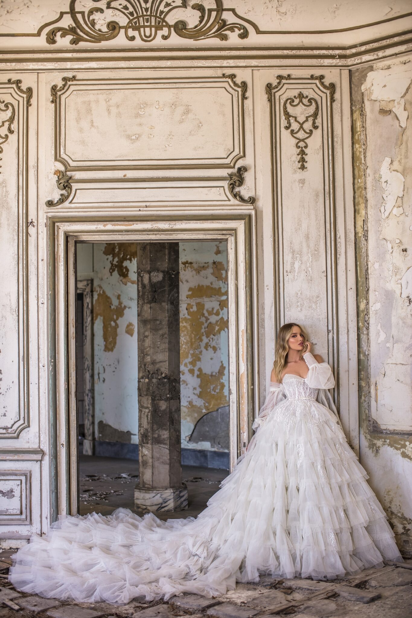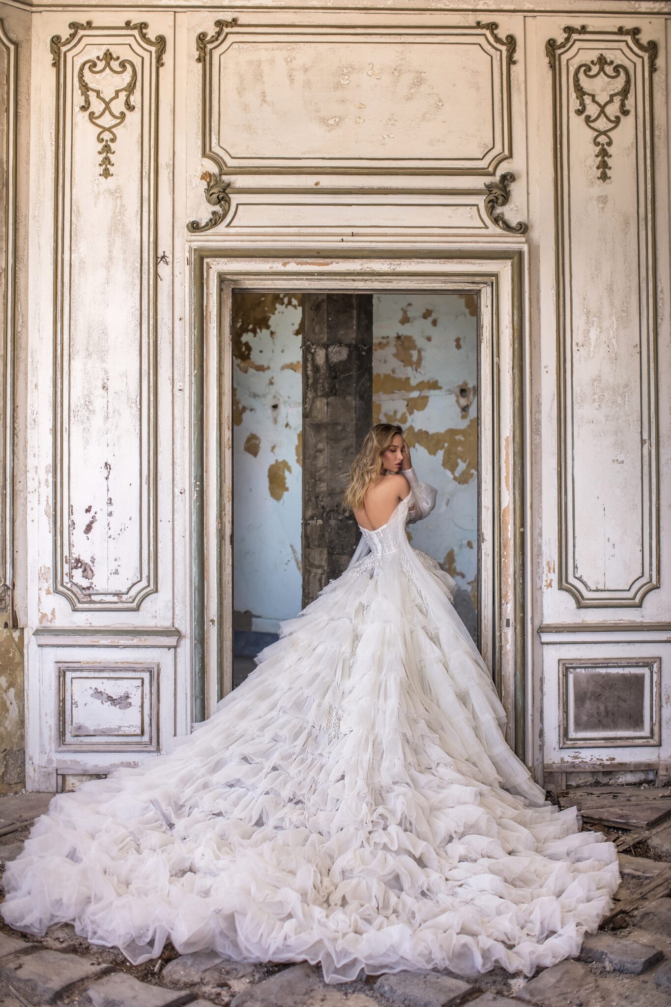 AuroraVictory bridal gown looks like a true piece of art. The combination of veiling and the laconic fabric looks Original and gorgeous. Sweetheart corsage is decorated with lace. A skirt is made of short layers of veiling and the skirt looks splendor. Sleeves are made of veiling and supplemented with long stripes. Cuffs with white Buttons complete this wedding dress.