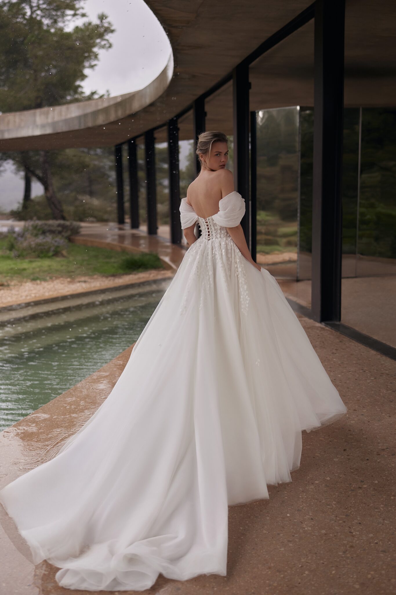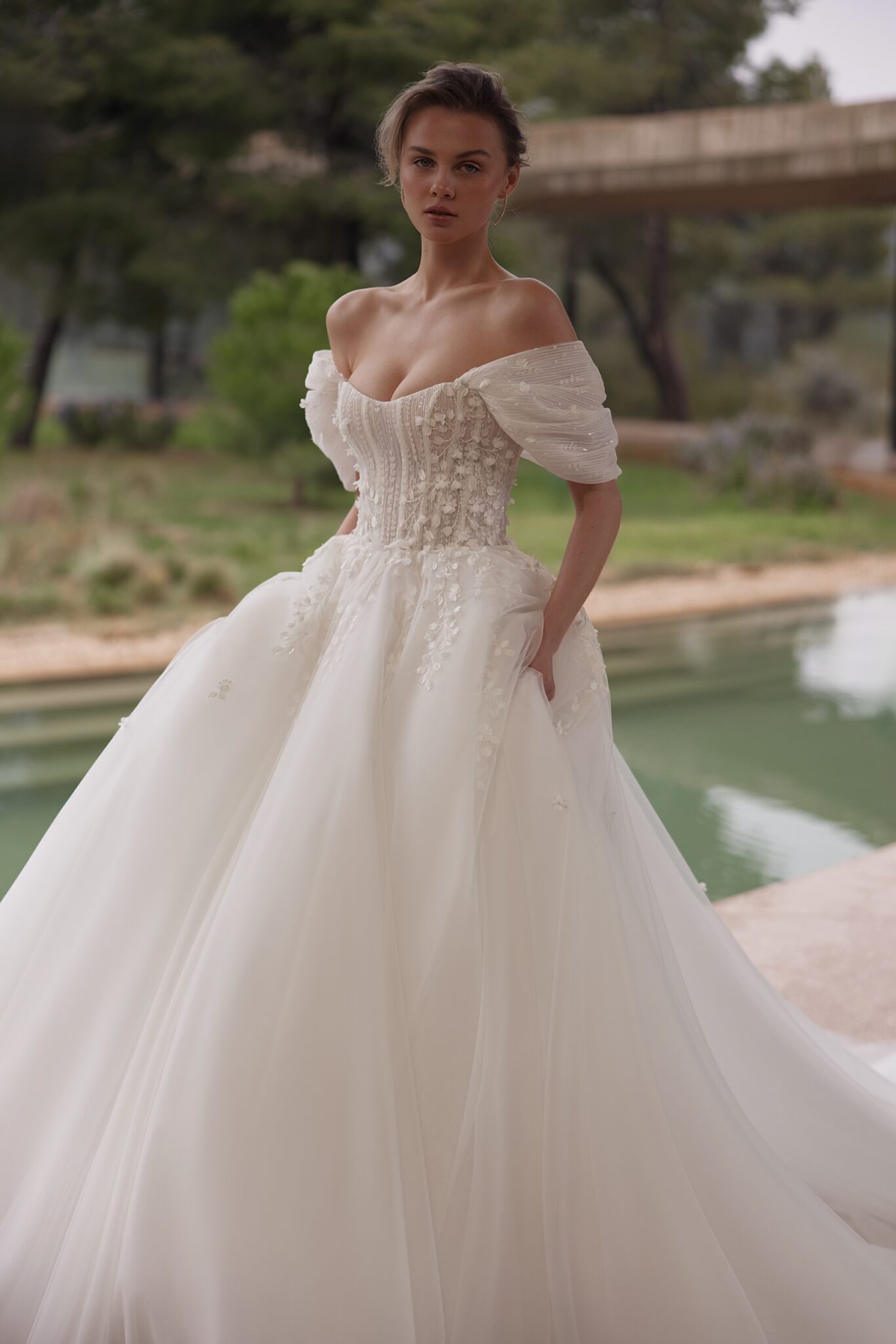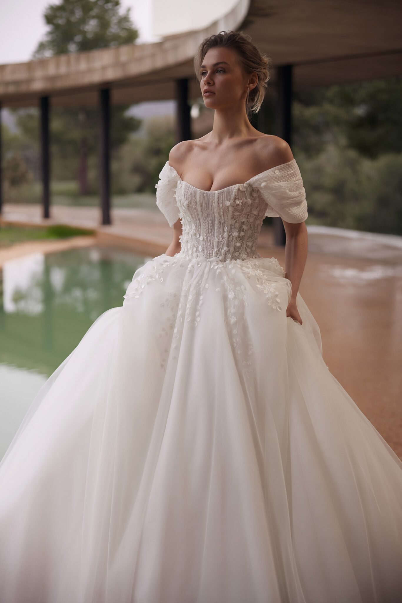 Less is More VVida is a gown with off-the-shoulder sleeves,