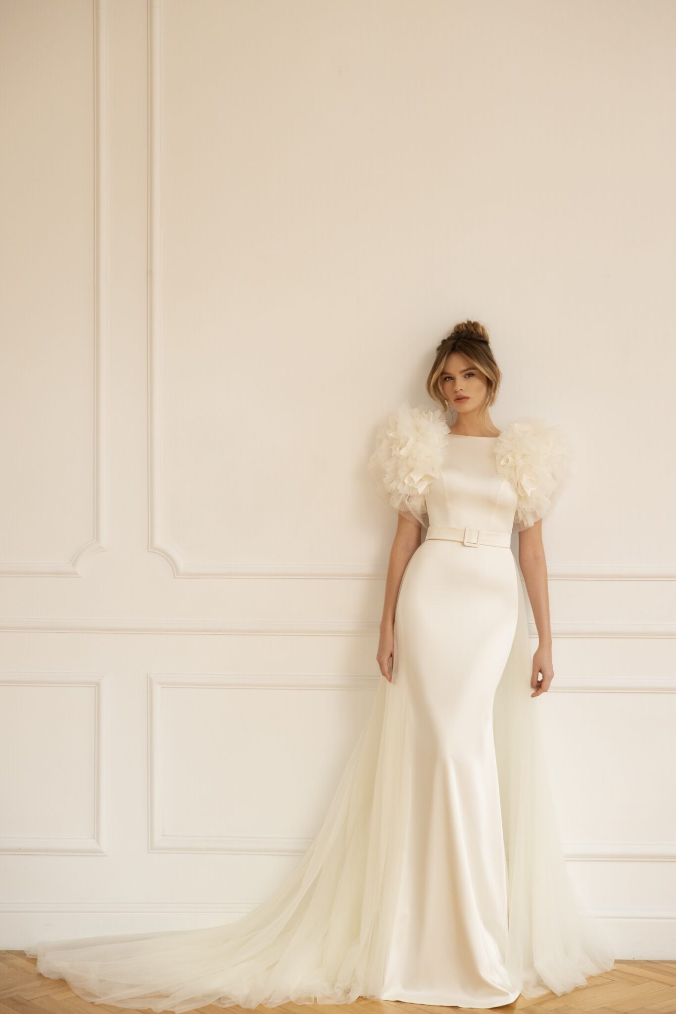 Less is more 2023An effortless fusion of minimalism and modernity. Vienna is a timeless sheath gown with a daring Low back. The silky sheath skirt flows into a subtle Tulle train which elongates the bride’s silhouette and a stylish belt with a buckle makes the dress more trendy. Vienna features amazing voluminous statement Tulle sleeves that are attached on the shoulders for a dash of sensuality