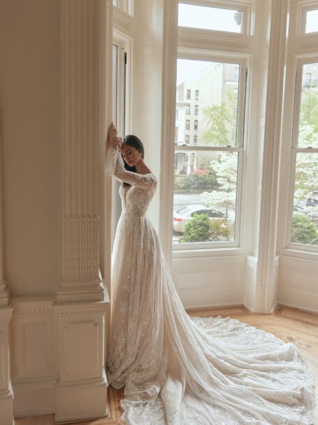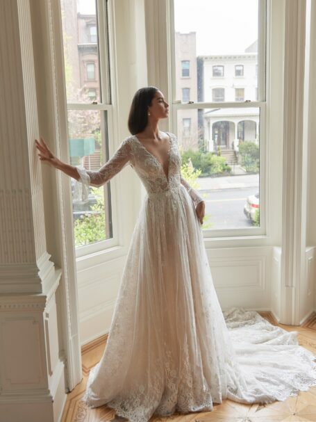 Love in the City, Plus SizeA tender and laconic wedding gown with spectacular 3D lace and embroidery. A bodice with lowered shoulders has a sweetheart neckline. It is decorated with a floral pattern and embroidered with beads and spangles. Lace inserts are also found on a veiling skirt. This fabulous skirt passes into a long train.