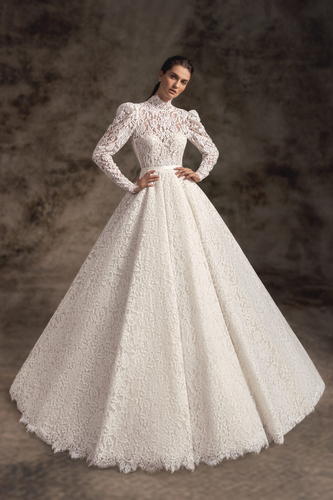 Notte d'OperaVintage is a true queen-inspired ballgown adorned with massive embroidery which trickles down the voluminous full skirt with a fantastic train. A beautiful Closed corset with high collar is covered with the same lace with long pointed sleeves bolero with high neck and a row of Buttons on the back.