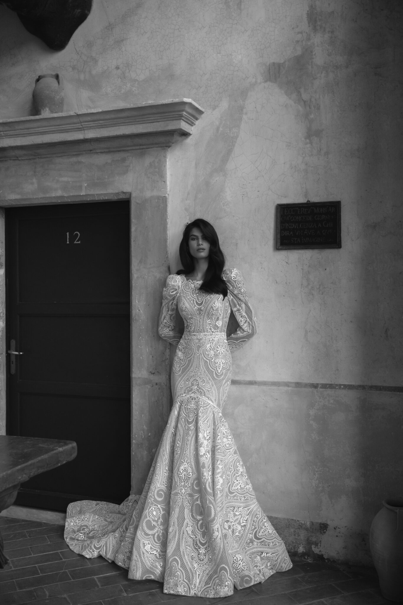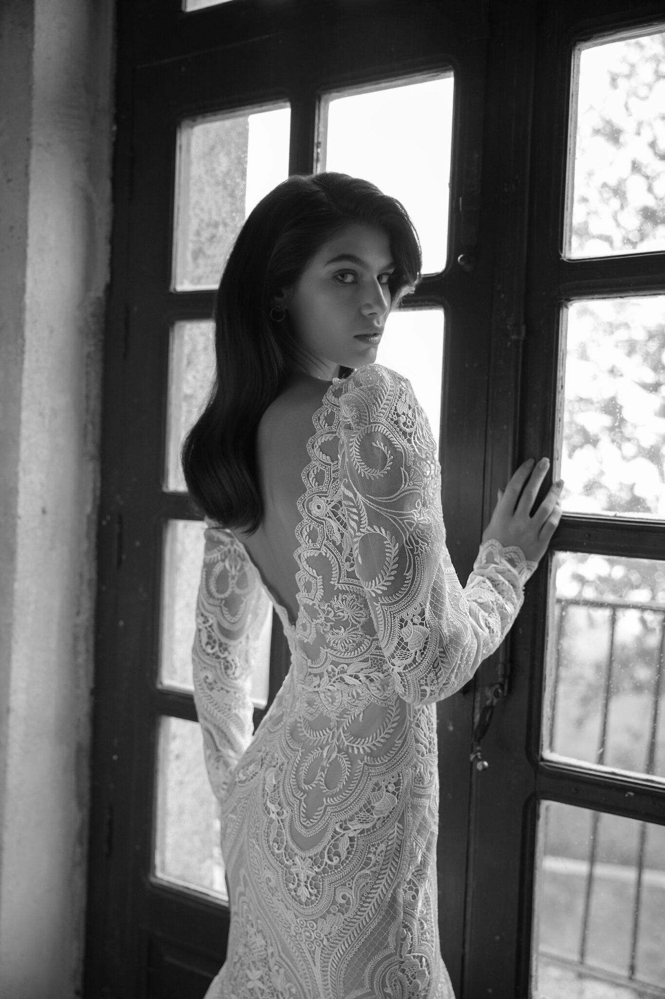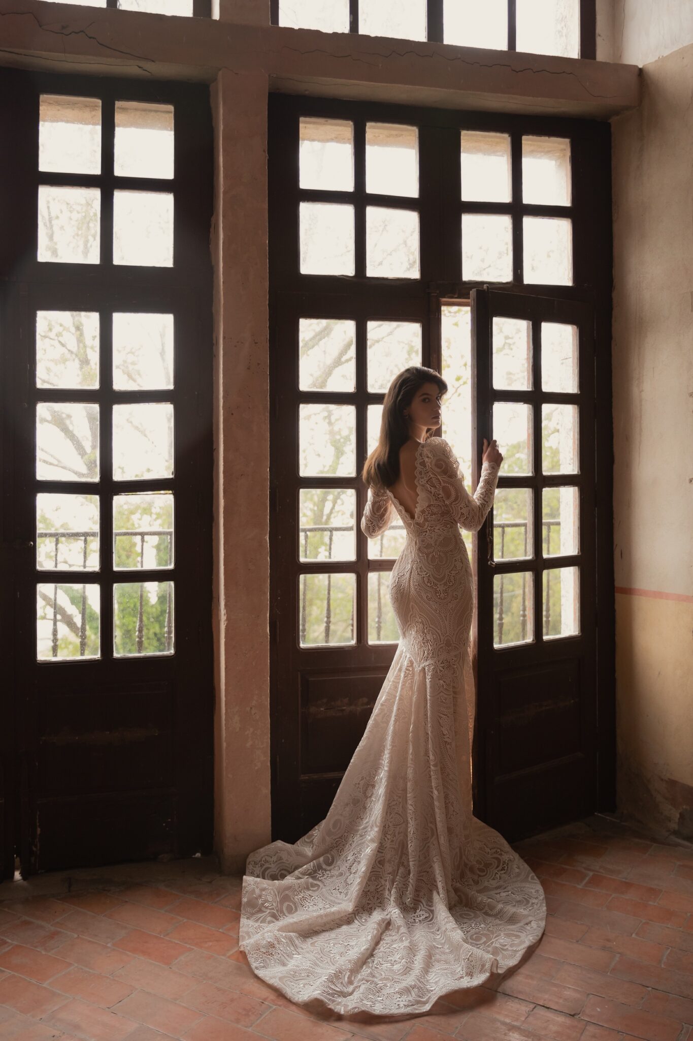 Made 4 LoveViva is a perfect choice for elegant and modest brides. The laconic mermaid silhouette accentuates the figure with long sleeves with take-ups and Closed Boat neckline adding solemnity. The whole dress is made of textured patterned lace. The special detail is hidden in the extra-low bodice that bares the bride’s back. The skirt has a small delicate chapel train.