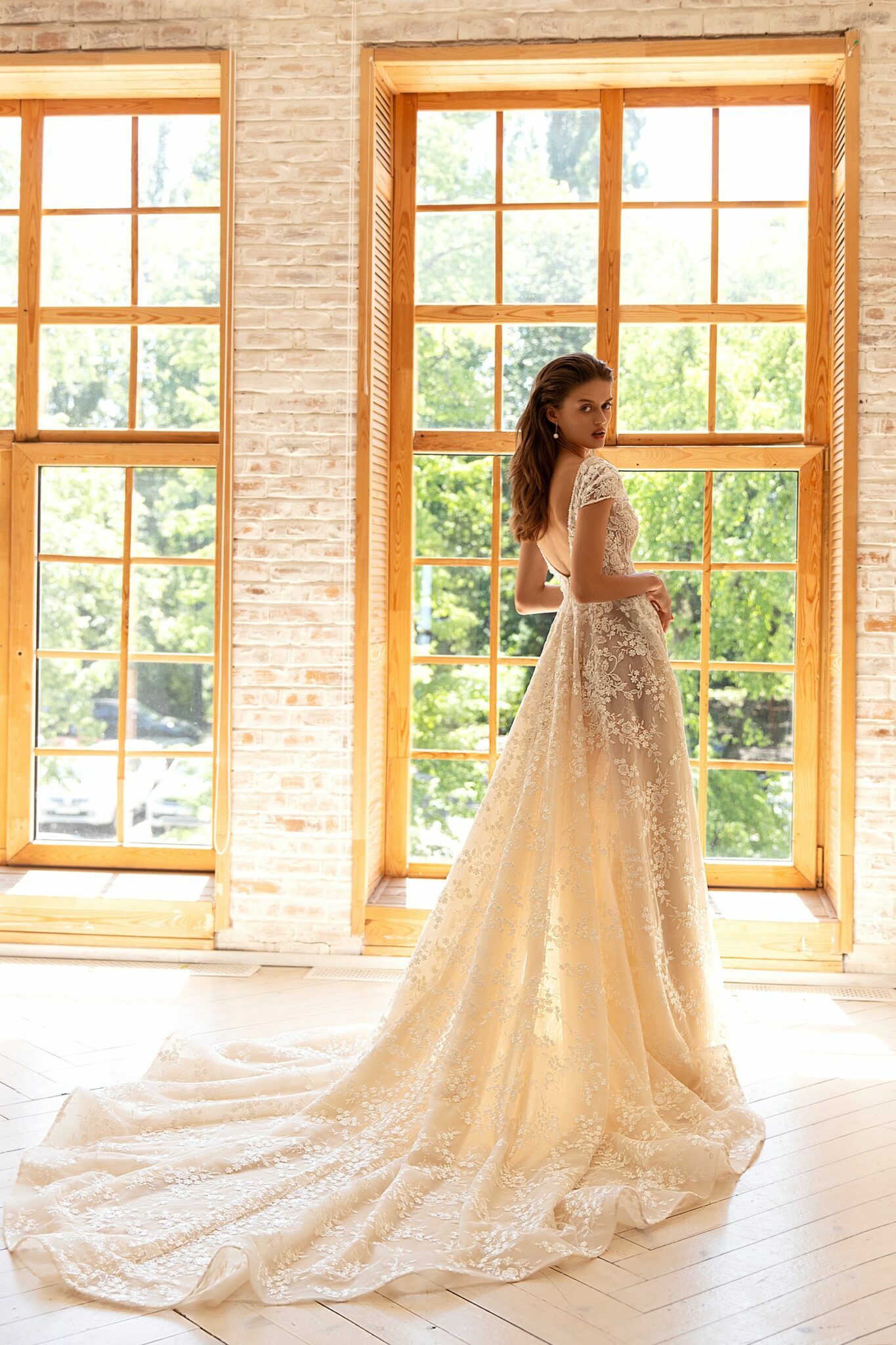 RomanceWillow is a tender A-line wedding gown. It is made of fabulous lace with a floral pattern. A dress is embellished with short sleeves and a V-shaped low neck. This low neck is decorated with beads. A deep neckline adds elegance. A fantastic skirt passes into a long train.