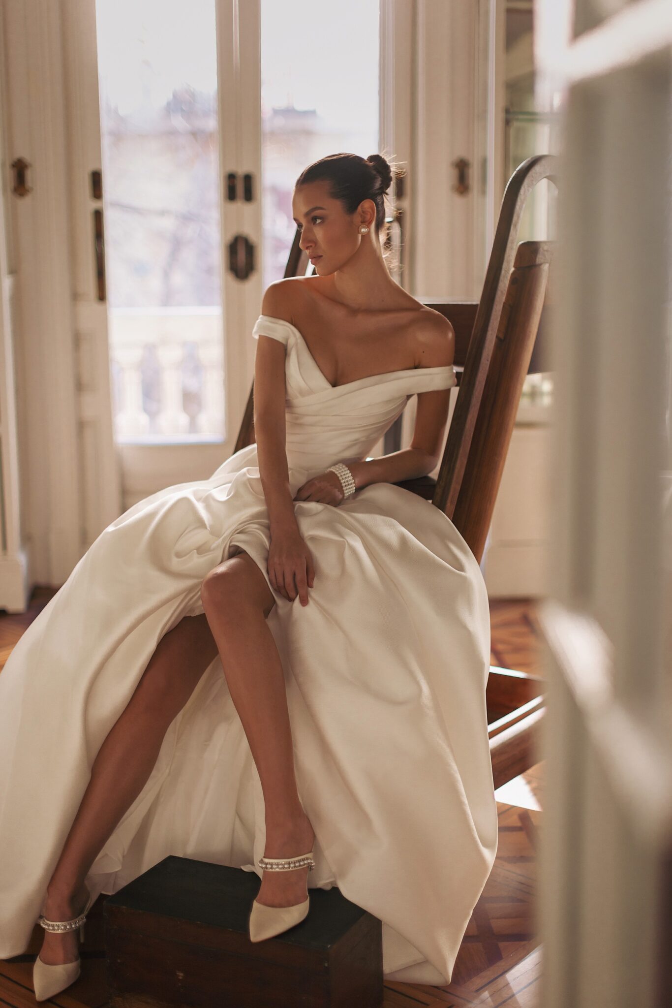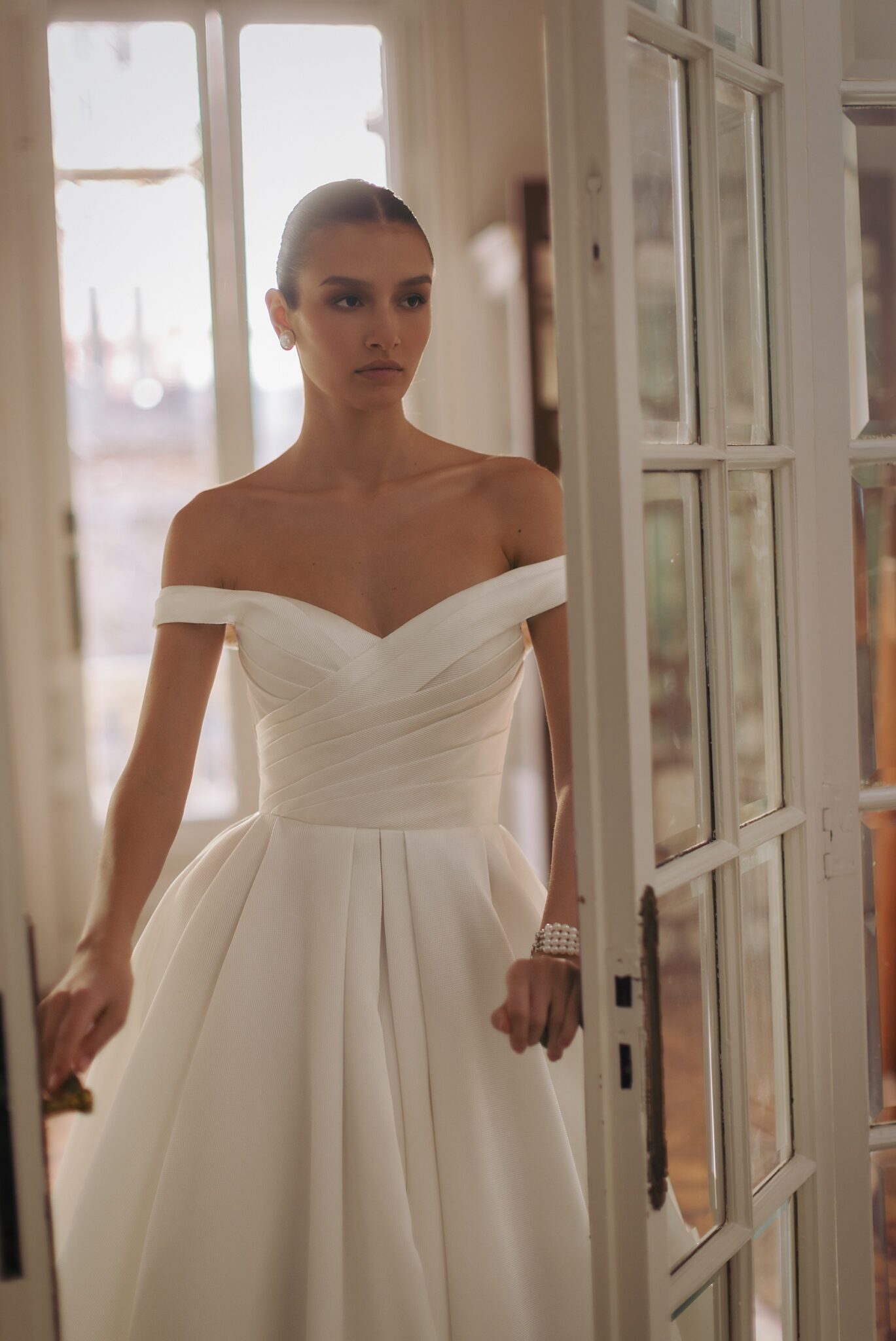GeminiWisla – wrapped cold-shoulder top with smooth V-shape neckline and gown-like voluminous skirt featuring an open V-shape back.