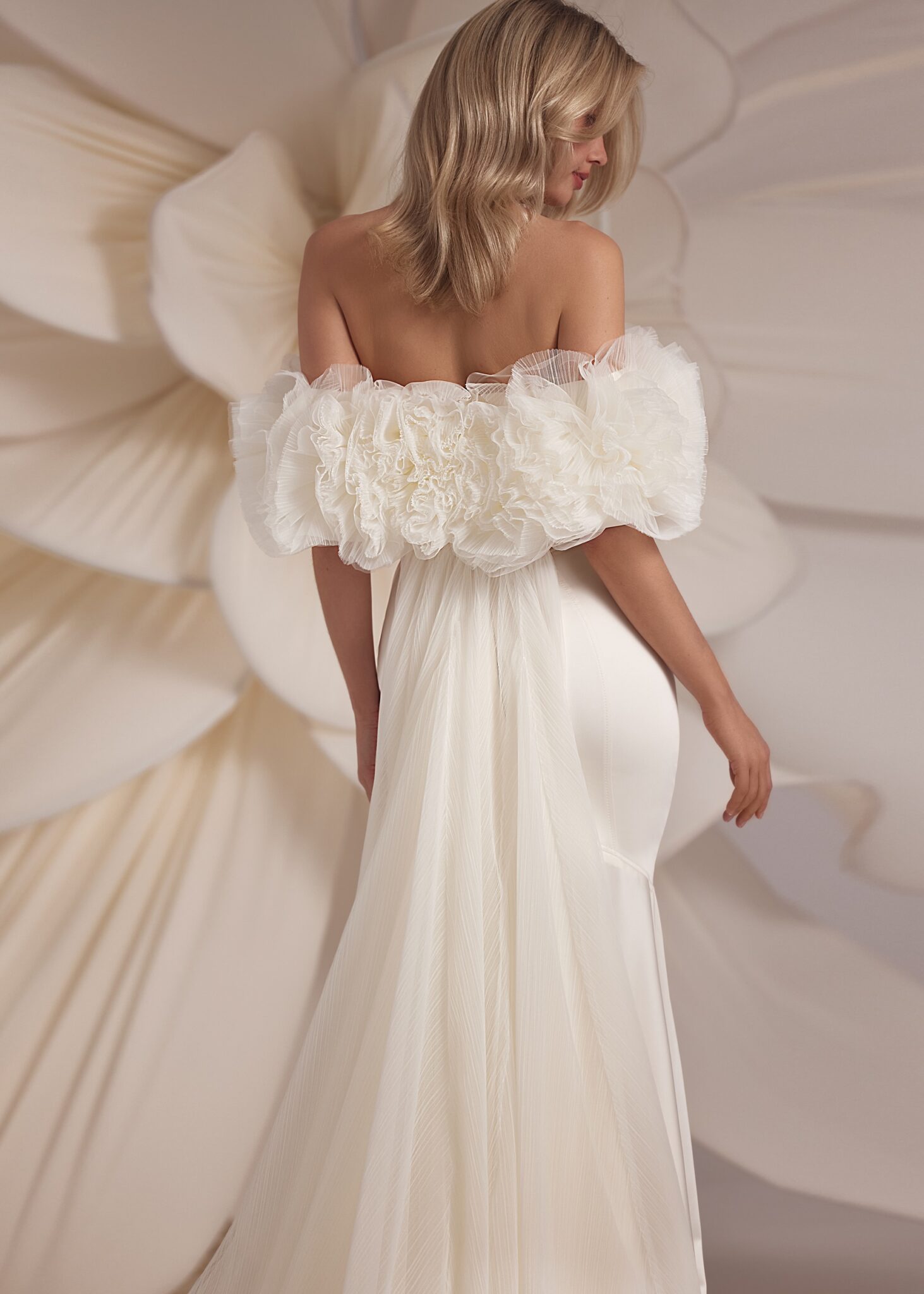 Less is More IVZara – mermaid tail silhouette with strapless detailed corset and pleated bottom part of the skirt. Complemented with a voluminous tuille ruched bolero with a simple veil extension.