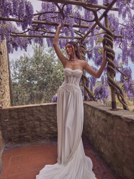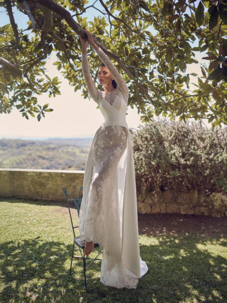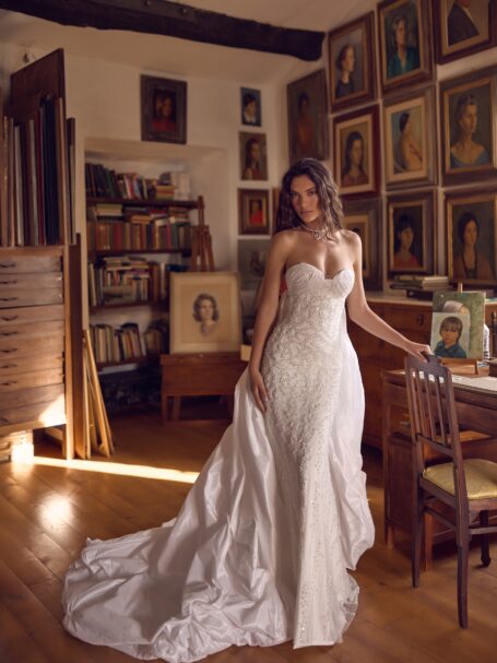 Have you considered a jaw-dropping and dramatic entrance for your ceremony? Our luxurious cathedral-length train wedding gowns will make you queen of the spotlight, ensuring all the guests’ eyes are on you. Our exclusive models balance timeless traditional design and dazzling elements to enhance your natural beauty. Feel like a real-life princess with our mesmerizing cathedral train dresses!