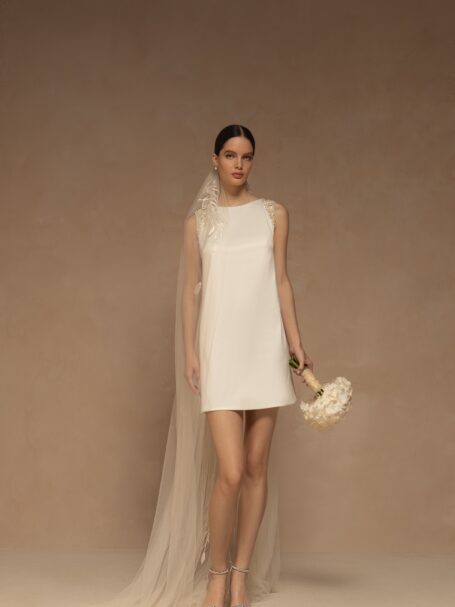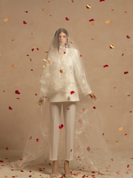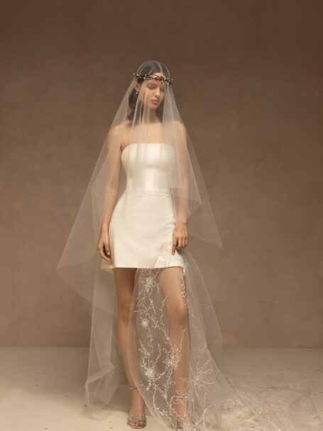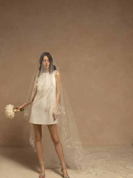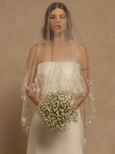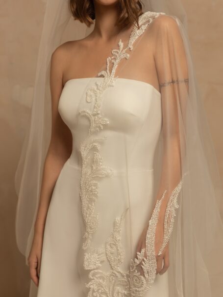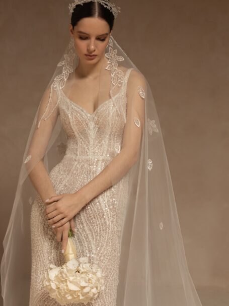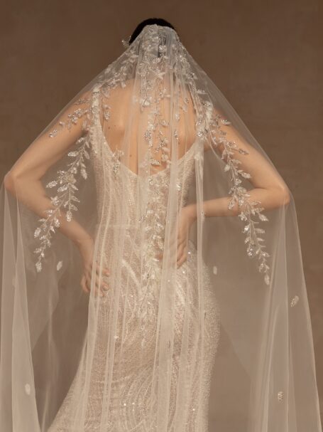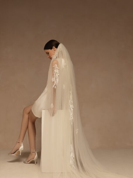 The best advice for creating a flawless bridal ensemble is to keep it simple without overwhelming your look. If the dress has statement details, voluminous skirts, and rich decorative elements, go for a simple sheer veil to add a delicate touch. A minimalist or pure silk gown will look absolutely magnificent with extravagant bridal veils embellished with applique or pearls.