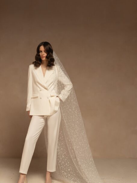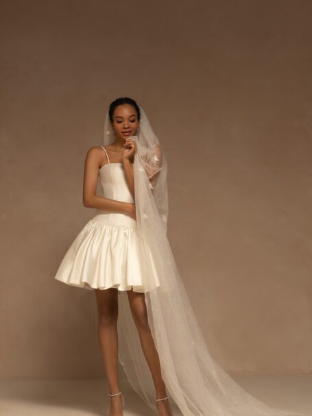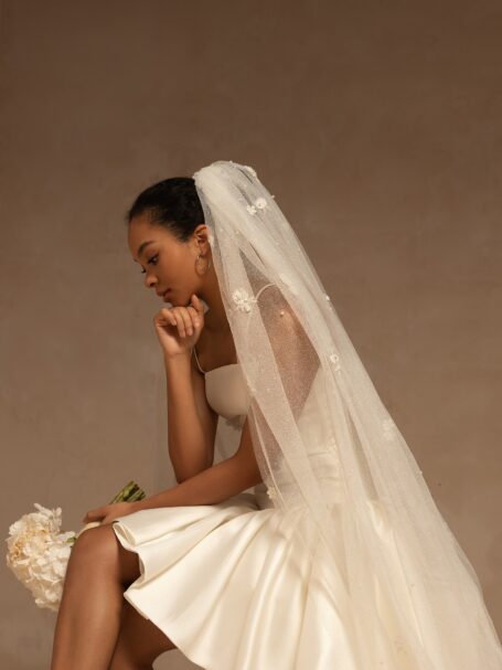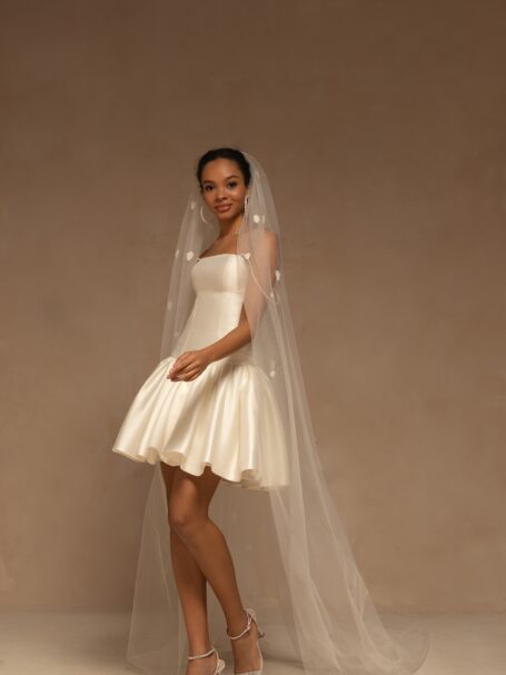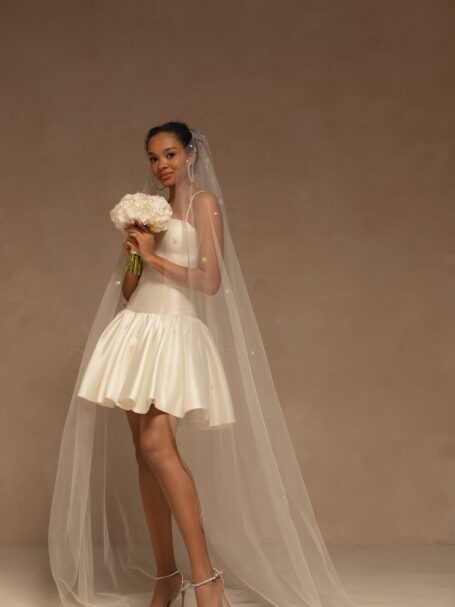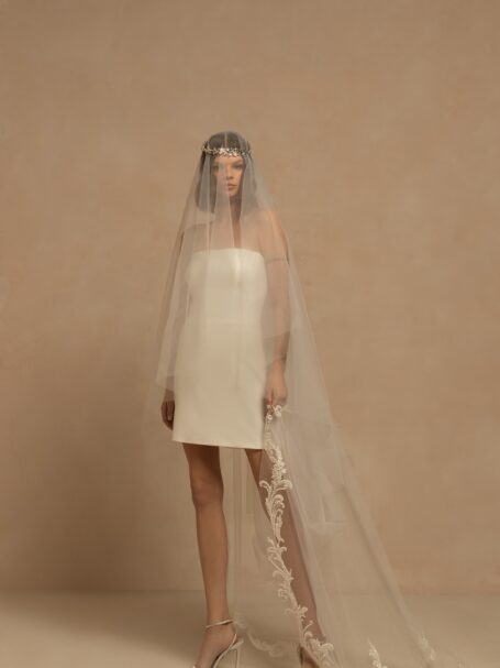 The chapel veil is the classic option that cascades down to the floor. Usually, it measures from 85 to 95 inches long, depending on the bride’s height. Traditionally, it reaches out to the hemline of the dress or puddles on the floor.