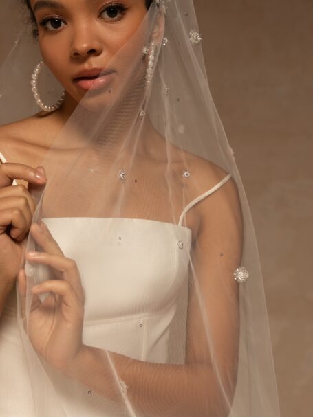 Complement the gown and enhance the natural beauty with a magical veil that flatters your bridal style. Add a romantic flare with tender lace elements and embroidered edges. Go full Hollywood glam with shimmery fabrics, sequins, and glitter. Or create an editorial wedding day ensemble with a veil stuffed with pearls or decorated with shiny rhinestones.